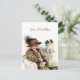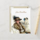 Cena vintage encantadora com uma senhora elegante em um grande chapéu chique segurando seu cachorrinho. Personalize o texto na frente e dentro do cartão.
