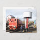 Um belamente restaurado trem a vapor enchendo com água do tanque de água. Uma caixa de sinal restaurada está em segundo plano.