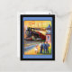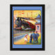 Trabalho de arte maravilhoso com três engenheiros de trem e uma garotinha assistindo como um enorme trem a vapor chega como estação.