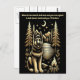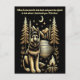 Uma ilustração detalhada de um cão German shepherd sentado numa fogueira na natureza. A cena é marcada à noite, com estrelas brilhando sobre as montanhas e árvores.