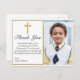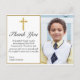 Obrigado seus amáveis amigos e família por frequentar a Primeira Comunhão do seu filho ou filha ou por enviar um presente pensativo. Este design apresenta uma simples e bela cruz de ouro com um quadro de ouro contra um fundo branco clássico. Personalize o texto e a fonte de seu gosto. Adicione uma imagem do seu filho e escreva um obrigado que não tenha com a sua assinatura. Outras fontes e estilos disponíveis.