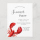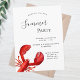 Um convite elegante para uma costa náutica pela festa de verão do mar, festa de praia ou mariscos. Um fundo branco e uma grande lagosta vermelha como decoração. Modelos para detalhes de sua parte, informações. Traseiro: cartão postal simples