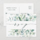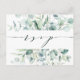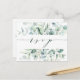 Este cartão de confirmação de presença para casamento apresenta eucalipto pintado a aquarela, verde botânico e folhas azul claro com caligrafia estilosa.