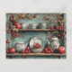 Bonito colheita, prateleira de cozinha rural com morangos vermelhos, maçãs e framboesas. As prateleiras têm pratos florais bonito, elegantes, vermelhos, bule, pote de café, açúcar e creme.