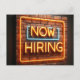 Um sinal de neon com texto "NOW HIRING" é montado em ângulo em uma parede de tijolos brilhando com uma iluminação laranja brilhante. O texto pode ser alterado.