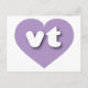 Este cartão-postal apresenta um coração lavanda contendo as letras maiúsculas vt, brancas, arredondadas e em negrito, uma abreviação lúdica para Vermont, o estado verde da montanha. O reverso da placa é vazio, aguardando seu texto personalizado ou sentimentos escritos à mão.