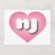 Este cartão-postal apresenta um coração rosa com um centro lavado em branco contendo as letras minúsculas brancas, negrito e arredondadas nj, uma versão divertida da abreviação de Nova Jersey, o estado jardim. O verso do cartão-postal está em branco, aguardando seu texto personalizado ou sentimentos manuscritos.