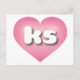Este cartão-postal apresenta um coração cor-de-rosa com um centro lavado em branco contendo as letras maiúsculas, brancas, em negrito, arredondadas, uma abreviação lúdica para o Kansas, o estado do girassol. O reverso do cartão postal é vazio, aguardando seu texto personalizado ou sentimentos escritos à mão.