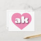 Este cartão-postal apresenta um coração cor-de-rosa vibrante contendo as letras maiúsculas, azuis, redondas, e minúsculas ak, uma abreviação lúdica para o estado do Alasca.