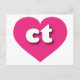 Este cartão-postal contém um coração cor-de-rosa vibrante e em forma quente, contendo as letras maiúsculas em negrito, arredondada, branca, ct, uma versão lúdica da abreviatura para o estado de Connecticut, o estado de constituição. O reverso do cartão postal é vazio, aguardando seus sentimentos manuscritos ou texto personalizado.