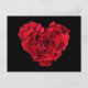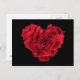 Lindas rosas vermelhas e pétalas rosa, dispostas em forma de coração em destaque contra fundo preto no cartão-postal.