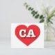 Este cartão-postal apresenta um coração vermelho vibrante contendo as letras maiúsculas, brancas e em negrito CA, a abreviação oficial para a Califórnia, o estado do ouro. O reverso do cartão postal é vazio, aguardando seus sentimentos manuscritos ou texto personalizado.