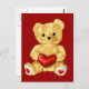 Cartão postal bonito com ilustração de um ursinho de pelúcia liso segurando um coração vermelho sobre um fundo vermelho.