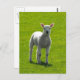 Uma fotografia de um cordeiro branco em um campo verde. Tirada na Grã-Bretanha.