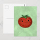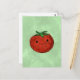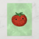 Um tomate vermelho no estilo de desenho animado em fundo verde claro. Cartões postais personalizados. Design desenhada à mão. Dar uma ideia para pessoas de todas as idades que amam tomates e legumes fofos.