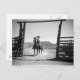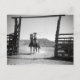 Cowboy no cavalo cavalgando por um portão enquanto andava no Pitchfork Ranch perto de Meeteetse, Wyoming.