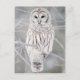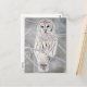 Cartão de animal mostrando uma coruja barrada sentada em um galho nevado. A coruja barrada (Strix varia) é uma grande coruja típica nativa da América do Norte. Tem uma face pálida com anéis escuros à volta dos olhos, um bico amarelo e olhos castanhos. É a única coruja típica dos Estados Unidos orientais que tem olhos castanhos; todas as outras têm olhos amarelos. As partes superiores são marrons-cinzas. As partes inferiores são leves com marcas; o peito é barrado horizontalmente enquanto o ventre está listrado verticalmente. As pernas e os pés estão cobertos de penas até os talões. A cabeça é redonda e carece de tufos auriculares, uma distinção em relação à coruja de orelha curta, ligeiramente mais pequena, que favorece habitats mais abertos e marginais.