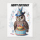 Cartão Postal Coruja vestindo chapéu de aniversário atrás do bol