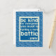 Todo mundo precisa me pegar às vezes, e este na moda e cartão-postal de bom gosto oferecem palavras excelentes de inspiração para qualquer um. O cartão-postal diz: "Seja Gentil Para Todos Que Você Encontra Está Lutando Uma Batalha Duro - Platão". Esta é uma célebre citação de Platão. A citação é impressa em branco sobre um fundo azul. Este cartão-postal apresenta uma atraente borda azul e branca que inclui um estilo japonês, ondulado, padrão floral. Esses cartões postais são excelentes para professores, orientadores e diretores para decorar suas áreas de escritório ou de mesa. Eu os vi enquadrados e eles parecem fabulosos! São também excelentes de dar aos estudantes, ou para correspondência geral. A forma como o queres usar é da sua inteira responsabilidade! Cartões postais Zazzle são de qualidade de excelente, e extremamente barato. O cartão postal mede 5,6" x 4,25" em papel de estoque de cartão de alta qualidade. Por favor, envie-me uma mensagem se tiver quaisquer questões ou preocupações relativamente aos designs.