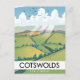 Cotswolds Para uma Pausa. Lindo pôster de viagem em estilo vintage de um avião biplano vermelho retrô voando sobre a paisagem.