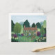 Apresentando uma ilustração encantadora de uma charmosa cabana aninhada em meio a uma exuberante vegetação e flores vibrantes, este cartão postal evoca uma sensação de vida pacífica no interior.
