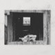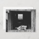Crânio de vaca sentado em uma janela cortada de um celeiro velho, com teias de malha acopladas ao crânio. O edifício era uma fazenda de gado, mas já não é utilizado.