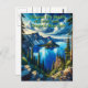 Uma cena pitoresca do lago Crater em Oregon, com a icônica Ilha do Feiticeiro no meio da água azul safira. O céu da manhã é adornado com nuvens brancas fluffy, lançando seu reflexo na superfície dos lagos. Os verdes vibrantes da floresta ao redor somam à beleza tranquila dessa maravilha natural.