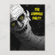 Halloween party invitation with a creepy vampire with pointed teeth and yellow eyes.