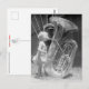 Esta é uma foto antiga de uma criança soprando no bocal de um tuba, um instrumento muito maior que a criança.