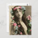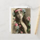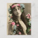 Vintage coloriu a fotografia de uma jovem de cabelo comprido, uma banda colorida à volta da cabeça e muitas flores à sua volta.