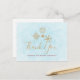 Cartão de agradecimento com ilustração de flocos de neve dourados sofisticados com formas cristalinas elegantes. Fundo azul claro gelado. Mensagem personalizada no verso.