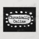 Um design tipográfico fofo que diz "Cronicamente Online". É um texto preto em um retângulo branco com pontos brancos divertidos e joguetões ao redor, tudo em um fundo preto.