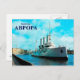 Uma renderização digital do cruzador russo Aurora amarrada no rio Neva na Rua. Petersburgo. O texto cirílico com a menção "Kreiser AVRORA" (The Cruiser AURORA) também aparece. O Aurora é um símbolo icônico da Revolução Russa de outubro de 1917. Na época da Revolução de fevereiro, o Aurora estava ancorado no rio Neva, em Petrograd (Rua Petersburgo), para reparos. Alguns tripulantes do navio tinham participado na revolução que resultou na abdicação do czar Nicholas II. Um comitê revolucionário foi criado no navio e a maioria da tripulação juntou-se aos bolcheviques de Lenine, que se preparavam para uma revolução comunista. Às 21H45 de 25 de outubro de 1917, a Aurora disparou um vazio da sua arma de encerramento para assinalar o início do ataque ao Palácio de inverno. A Aurora tem servido de navio de museu e atração turística para milhões de visitantes em sua atual localização em Leningrado (atualmente Ruas Petersburgo) por décadas.
