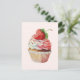 Um cartão postal com uma ilustração brilhante com um cupcake delicioso. Sorvete branco e um morango grande adoram este doce doce doce.