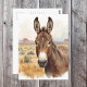 Mande um toque de charme desértico com este design de burro de aquarela. Apresentando um burro curioso contra uma paisagem sudoeste de mesas e tons de terra quente, ele combina personagem rústico com detalhes artísticos suaves para um cheio de cena de personalidade.