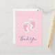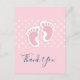 Cartão postal de agradecimento com uma imagem encantadora de pegadas de bebê menina rosa com bolinhas brancas em um fundo rosa por trás da ilustração.