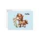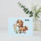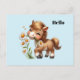 Um cartão postal com uma ilustração adorável. Um pequeno pônei marrom comendo margaridas felizes.