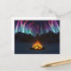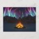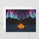 Em um vale coberto de neve em uma noite gelada no morto do inverno uma fogueira salta para cima para espelhar as luzes do norte enchendo o céu acima das montanhas distantes.