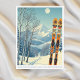 Olá das montanhas nevadas de Loon Mountain, New Hampshire! Esperamos que você esteja tendo umas férias de esqui maravilhosas. Este cartão postal apresenta uma paisagem montanhosa azul-cinza deslumbrante com pranchas de esqui retrô em um padrão tribal laranja.