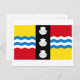 Cartão postal com a bandeira do condado histórico de Bedfordshire, na Inglaterra, Grã-Bretanha; bandeira vermelha e dourada com faixa vertical preta com três vieiras brancas no centro