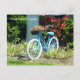 Fotografia de uma linda bicicleta azul com flores no cesto, fotografada em Punta Gorda, Flórida, impressa em um cartão postal. Fotografada no sudoeste da Flórida.