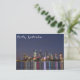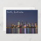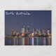 Cartão postal com uma fotografia do horizonte da cidade de Perth à noite, com reflexões coloridas no rio Swan, na Austrália Ocidental.