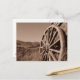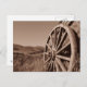 Uma velha roda de vagão numa zona rural em tons de sepia num cartão postal.
