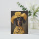 O elegante chic Dachshund no estilo do pintor holandês Frans Hals. Cachorro bonito vestindo um vestido amarelo e chapéu com flores amarelas