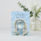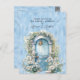 Um belo cartão postal azul de convite de casamento de uma porta azul, cercado por margaridas brancas e apoiado por um papel azul brilhante. Outras peças formam alguns produtos nesse conjunto.