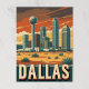 Um poster de viagens ao estilo vintage mostra o horizonte de Dallas, apresentando a icônica Torre de Reunião e outros arranha-céus modernos contra um pôr do sol laranja e vermelho sobre uma paisagem desértica com vegetação esparsa. "DALLAS" aparece corajosamente no fundo dentro de uma borda decorativa.