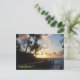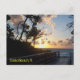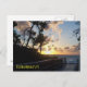 Uma fotografia da ascensão do sol em Dania Beach, Flórida. Há silhuetas de palmeiras e de uva-maria; você também vê um passeio de barco indo em direção ao oceano. No canto inferior esquerdo do cartão-postal está o nome do local, em uma fonte amarela.