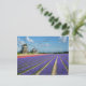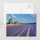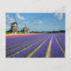 Cartão postal com flores de hyacinto roxa e rosa e três moinhos de vento na região de Bulb, nos Países Baixos.