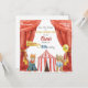 Suba. Que criança não queria uma festa de circo e este é o convite perfeito para enviar para dar o tom. O cartão postal mostra cores primárias brilhantes contra um pano de fundo de caracteres coloridos que mostra a hora e a data.