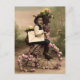 Cartão postal vintage romântico com lindas imagens antigas de um menino em uma bicicleta rodeado de flores e uma carta nas mãos. Este cartão postal com sentimento de nostalgia é perfeito para enviar cumprimentos de aniversário para seus amigos que gostam de coisas vintage e retrô